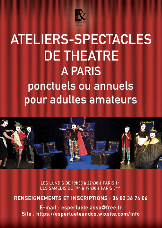 Création de spectacles amateurs ou professionnels. Ateliers de théâtre pour adultes. Chaque comédien amateur (débutant ou confirmé) peut s’exprimer sur de beaux textes, est valorisé, dans une troupe solidaire avec notre metteure en scène professionnelle Sylvie Mandier. Représentations dans petits théâtres parisiens.